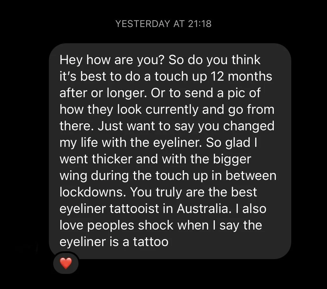 Be gentle to your new tattoo and do not touch it unnecessarily. Your eyes may be feeling more tender once the aesthetic wears off (2-3 hours post treatment). Healing/exfoliation can take anywhere from 4 to 10 days depending on the area tattooed, your skin type and your dedication to aftercare (the longer you take to heal the better colour retention you’ll see). Never rush the healing process. If you let your tattoo dry out too much during healing it will exfoliate too fast and could possibly heal patchy. Please don’t allow the tattoo to get too wet either (by applying the ointment too generously) as the tattoo can absorb too much moisture and become ‘puffy’. If touched or bumped in this puffy state it can damage the vulnerable skin. Ointment application should always be very thin, and the skin should appear glossy. We want a moist healing, never dry and never too wet. During the healing it’s very important to never itch, rub or pick at your tattoo (this can make for a patchy or lighter end result and can also result in scarring and/or infection). Note: itchiness is completely normal and healthy in the healing phase, please restrain yourself from scratching, the ointment should provide some relief.