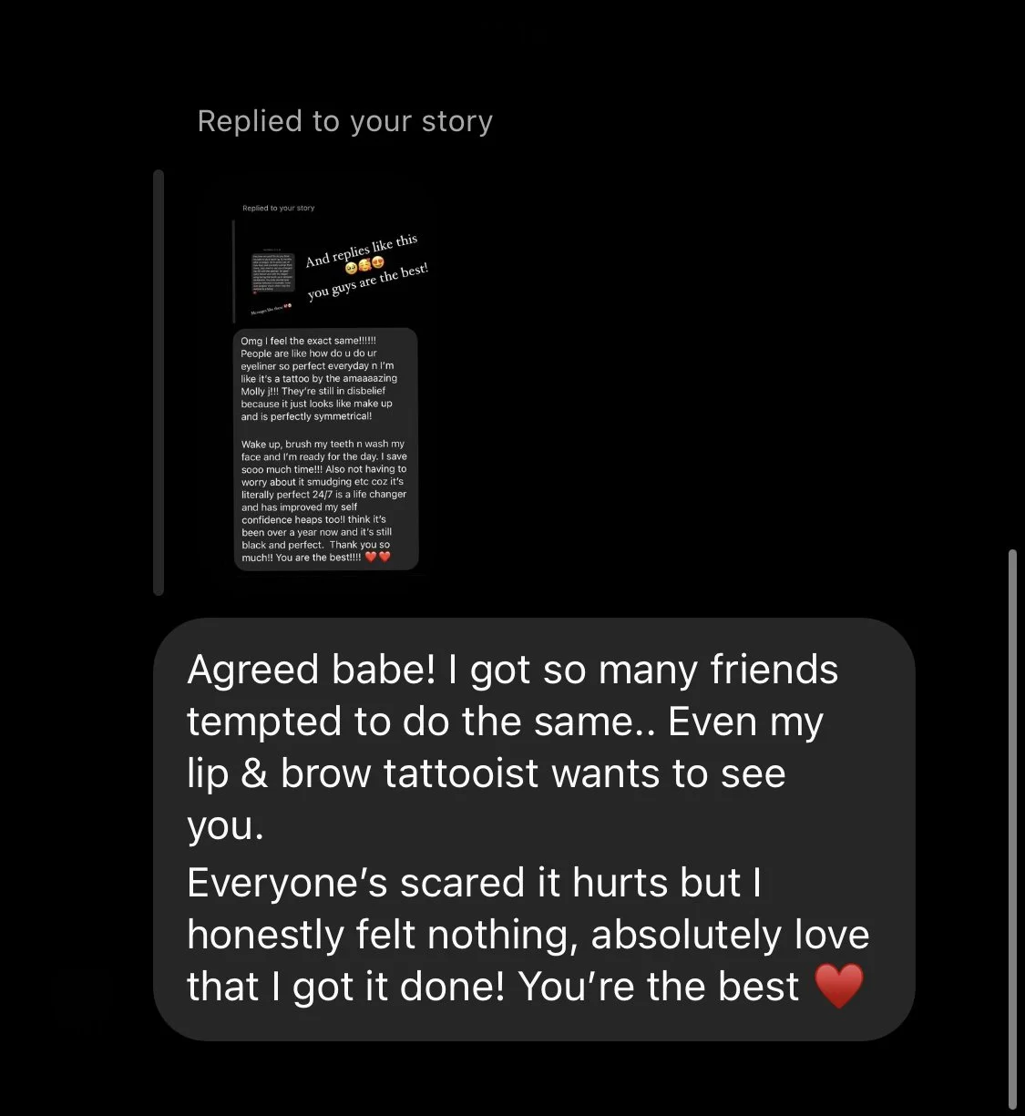 For some the healed tattoo will appear perfect, whilst others will experience extreme fading and be initially disappointed. Please note that 3 to 4 weeks after your session you will see more colour coming back through. Immediately after the exfoliation has finished you may be a little disappointed as your brand-new skin appears opaque with a ‘cloudy’ appearance and will take 3 to 4 weeks to turn back to its normal transparency revealing your true healed result. Trust in the process : )